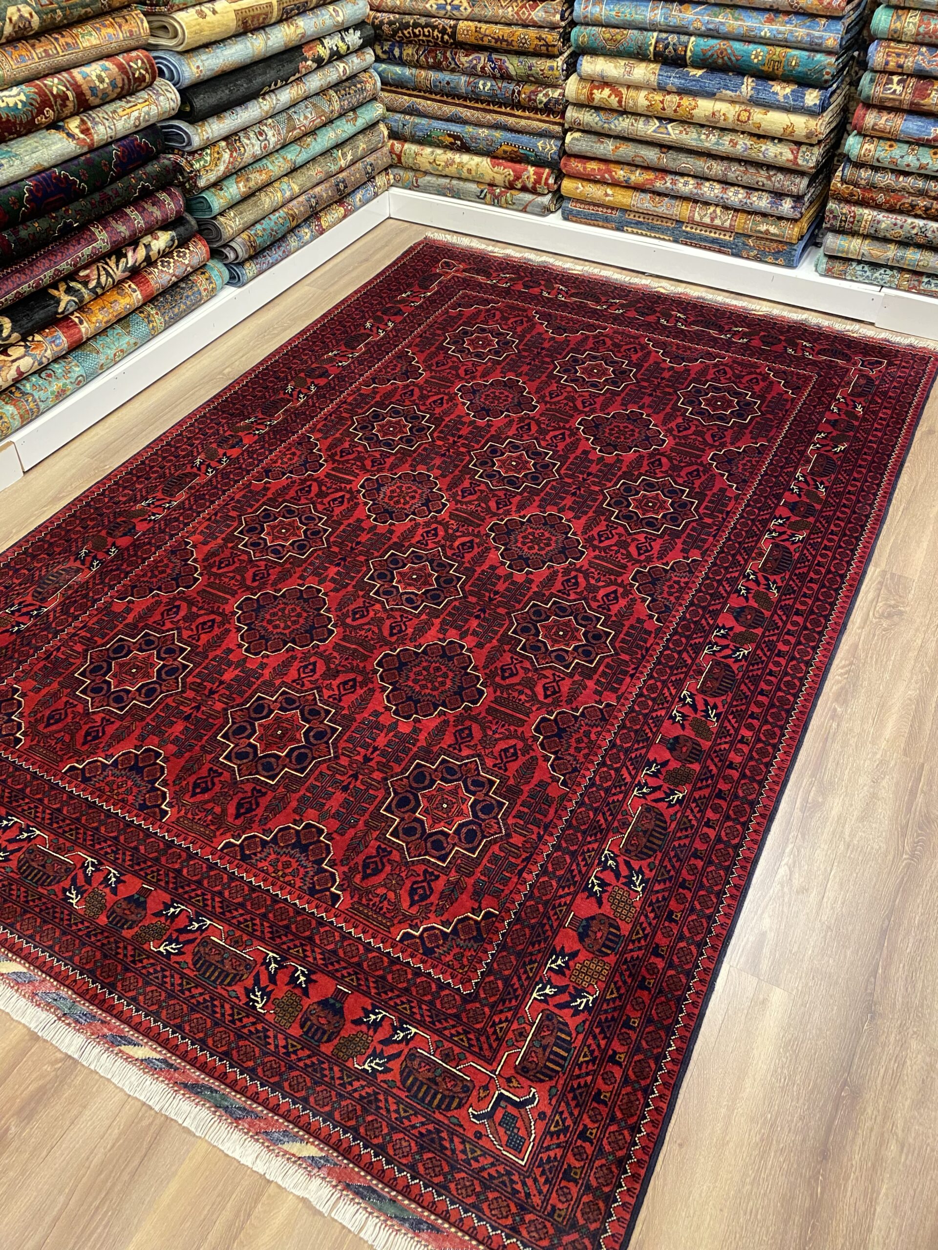 Bilicik halılarının etkileyici dünyasına adım attığınızda, sıklıkla yoğun ve tekrarlayan geometrik motiflerin, özellikle “göl” adı verilen sekizgenimsi desenlerin ve yıldız motiflerinin oluşturduğu görsel bir zenginlikle karşılaşırsınız. Sıkı el düğümü teknikleriyle dokunan bu halılar, hem dayanıklılıklarıyla öne çıkar hem de üzerlerindeki motiflerin netliğini sağlar. Bu incelikli ve özenli işçilik, mekanlara sadece karakteristik bir dokunuş katmakla kalmaz, aynı zamanda kültürel bir derinlik ve tarihi bir hava da sunar. Her bir Afgan Bilicik halısı, bulunduğu ortama karakter, sıcaklık ve otantik bir estetik getirir.