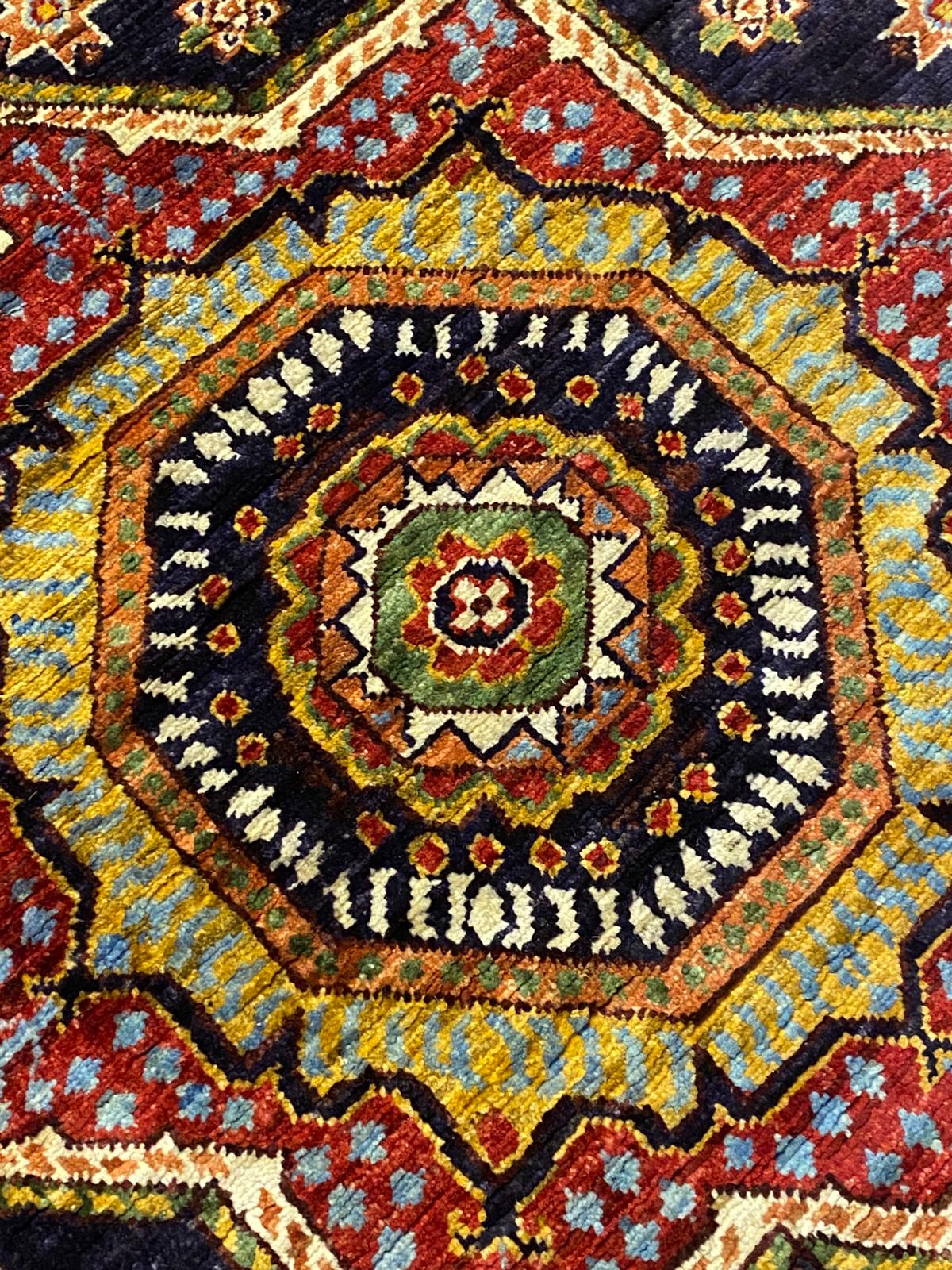 Afganistan’ın köklü dokuma gelenekleriyle, usta zanaatkârların elinde %100 doğal yün kullanılarak özenle dokunan bu halı, doğal kök boyalarla renklendirilmiştir. Memlûk halılarının ayırt edici özelliği olan merkezî madalyon ve detaylı iç içe desenler, bu eserde tüm ihtişamıyla yer bulur.